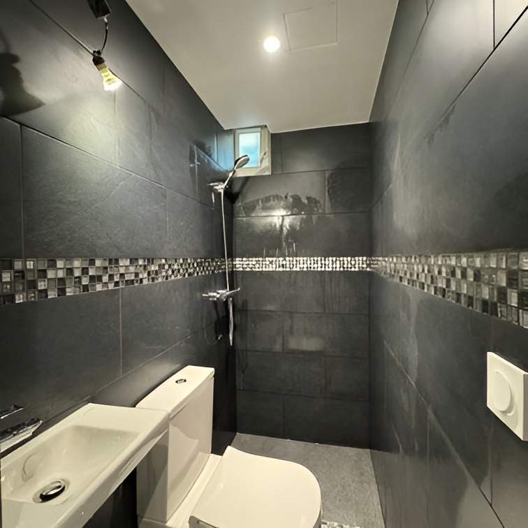 La zone douche a été entièrement refaite avec une douche à l’italienne, équipée d’une colonne de douche moderne et d’une paroi en verre transparent, offrant un rendu à la fois élégant et fonctionnel. L’étanchéité et les finitions ont été réalisées avec soin pour garantir durabilité et confort d’usage.
