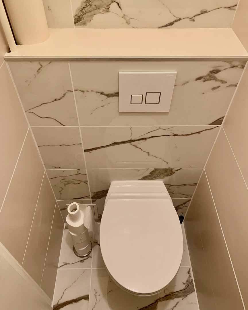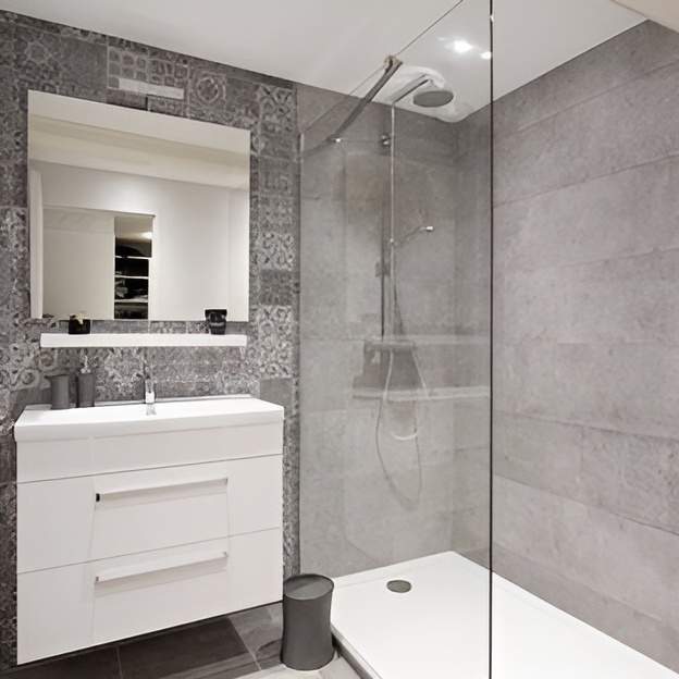 Nous avons posé un carrelage grand format 60x60 cm au sol et aux murs, avec le même matériau pour une continuité visuelle élégante et un effet d’agrandissement de l’espace.