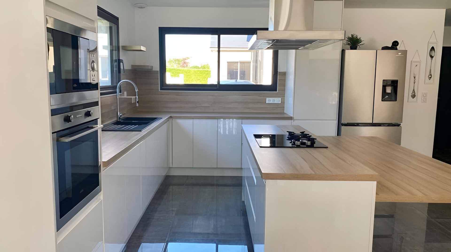 - Style et Matériaux : La nouvelle cuisine adopte un style moderne et épuré, alliant le blanc et le bois de chêne pour un rendu chaleureux et intemporel. La crédence en bois de chêne apporte une touche naturelle et harmonieuse à l'ensemble.