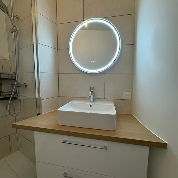 Un miroir rond rétroéclairé LED vient parfaire l’ensemble, apportant une touche moderne et une lumière douce et agréable.