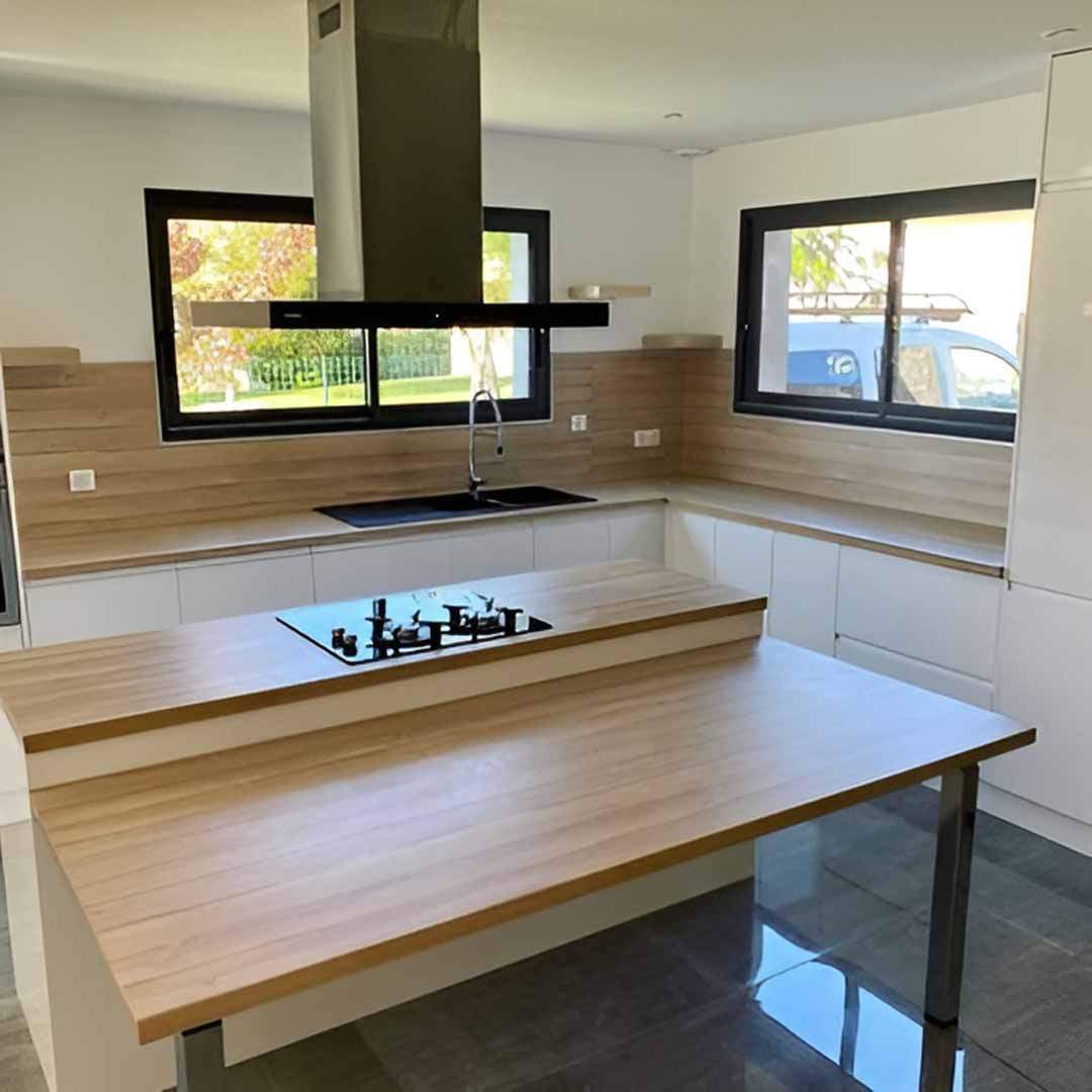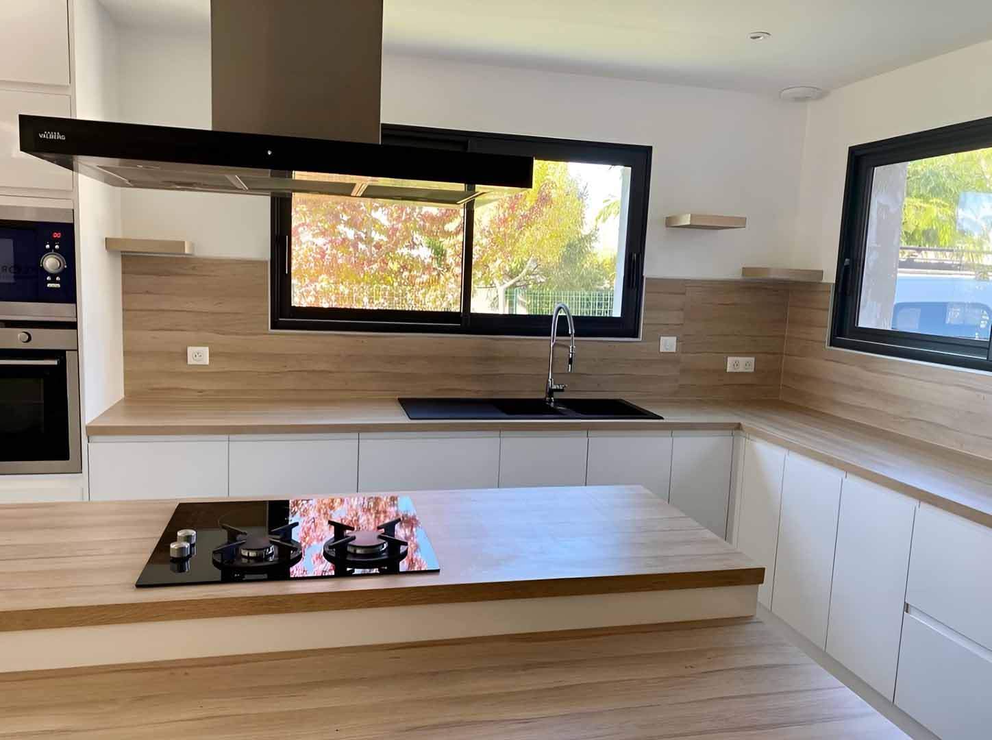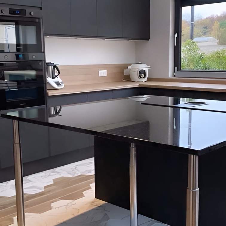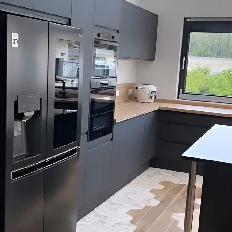 - Électroménager : Pour ajouter une touche de contraste et de modernité, nous avons choisi des appareils électroménagers noirs, incluant l'évier, la plaque de cuisson et la hotte.